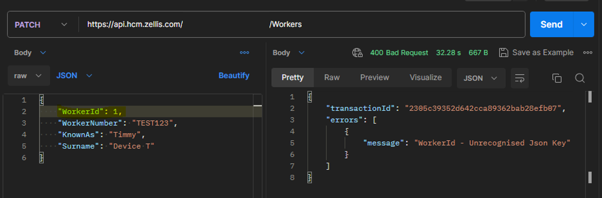 For example, within the Worker API, “WorkerId” is not permitted within the request body. If you attempt to pass this, an error will be generated as shown.